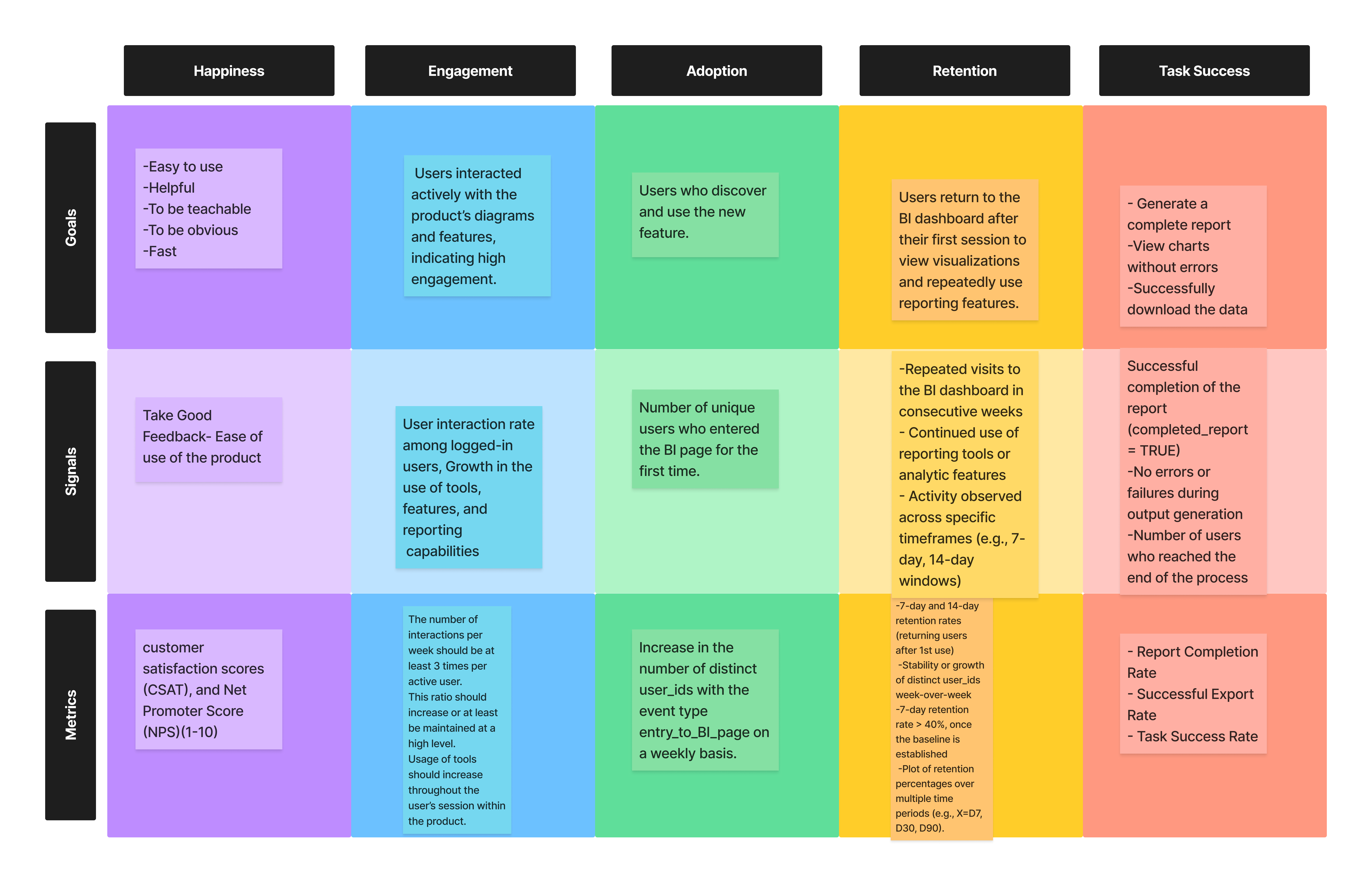 By using the HEART framework,  I try  to gain a deeper understanding of our users' experience, identify areas for improvement, and track the impact of changes made to the product. Based on  I am going to evaluate the BI  project which has designed by me.
